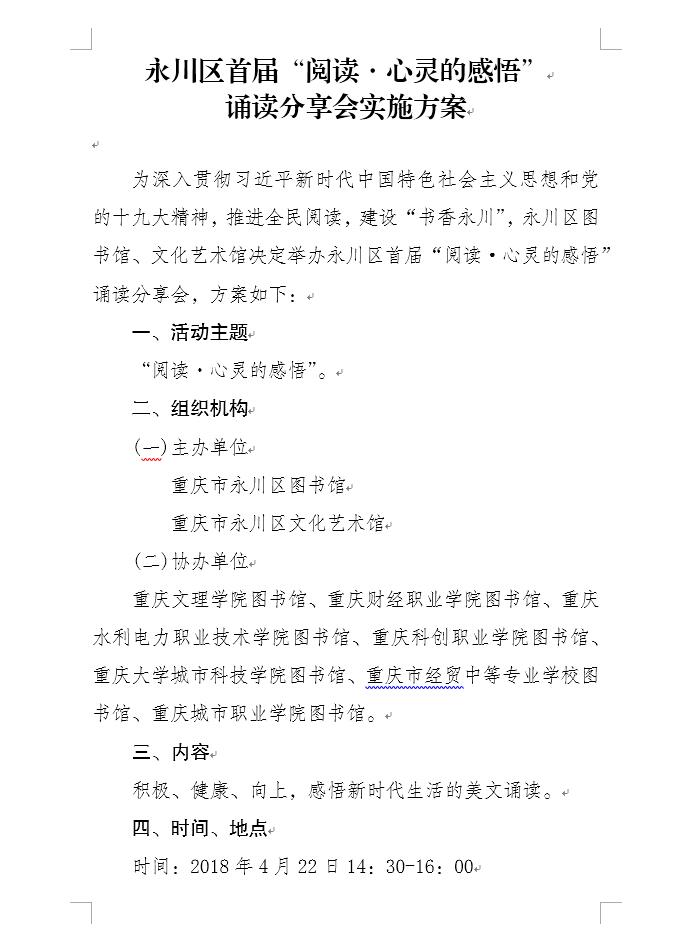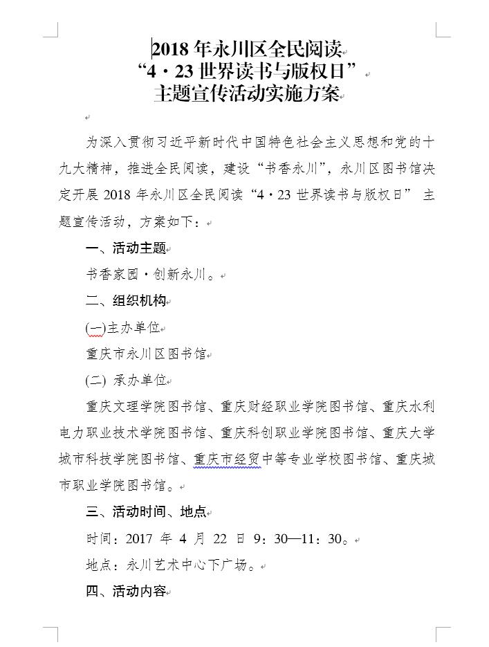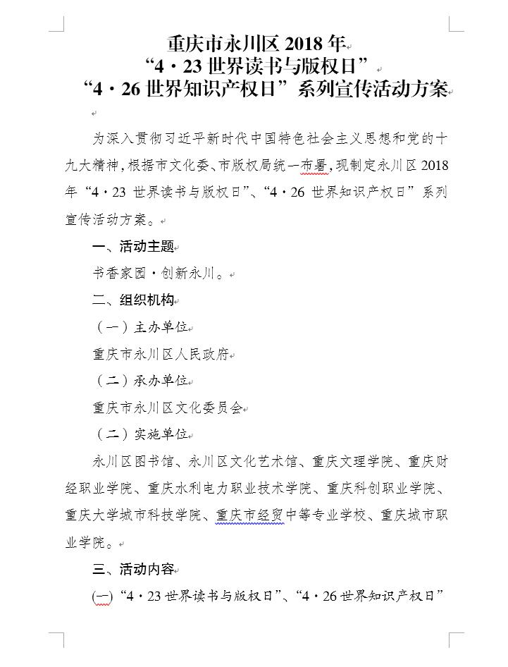 一、永川区2018年“4·23世界读书与版权日”暨“4·26世界知识产权日”系列宣传活动方案